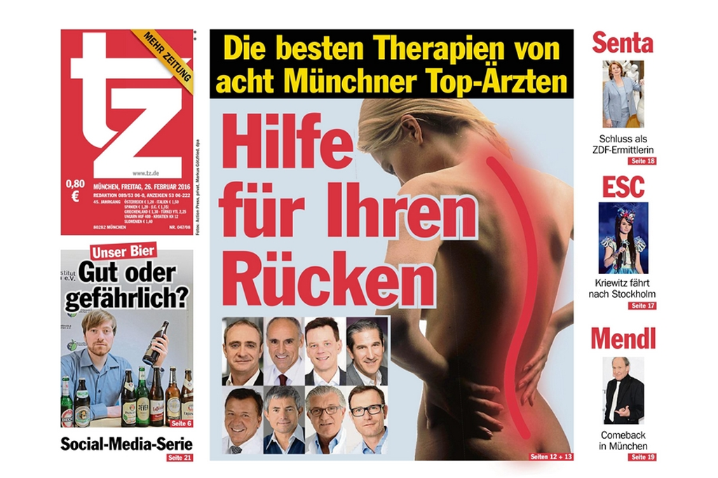Die TZ München präsentierte in der Ausgabe vom 26.2.2016 Münchens Top-Ärzte. Mit dabei Wirbelsäulenspezialist Dr. Ralf Rothörl, der zum Thema Facettenverödung beim Facettensyndrom interviewt wurde...